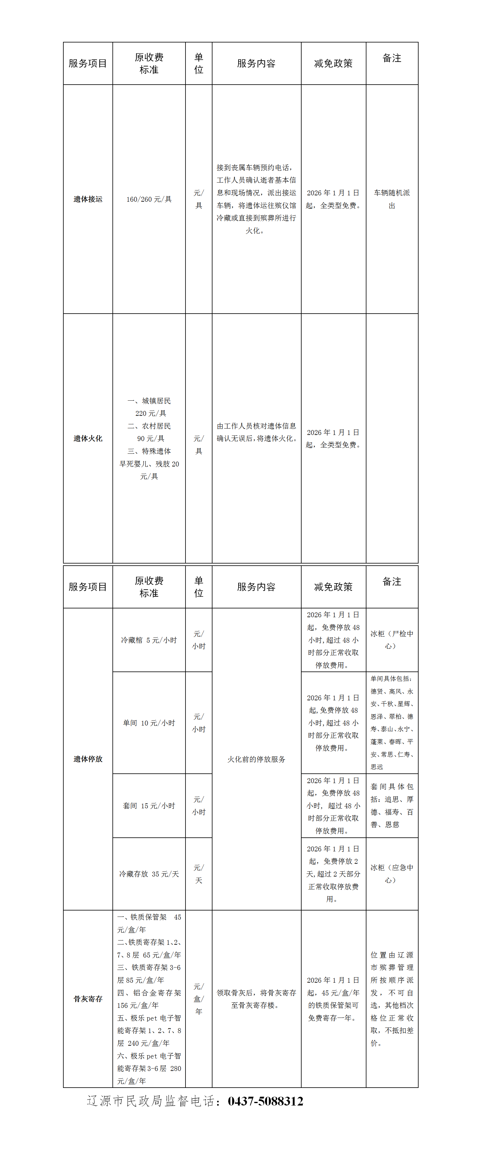 2026年1月1日起,辽源市全域实行遗体接运、遗体火化、遗体停放、骨灰寄存四项殡葬基础服务免费政策,具体详情如下: